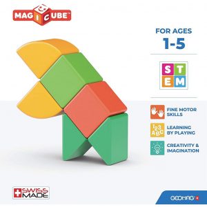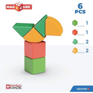 Komplet vsebuje 6 magnetnih kock v treh različnih oblikah. Primerne so za otroke od 1. leta dalje, z njimi pa bodo lahko ustvarjali barvite konstrukcije.