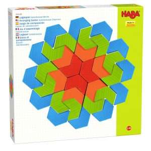 Lesena sestavljanka z barvitimi delčki, s katerimi lahko otroci ustvarjajo številne vzorce.