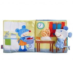Prijetno mehka knjiga iz blaga, ki bo otroka popeljala skozi večerni ritual pred spanjem. Glavna junakinja zgodbe je mala miška v obliki naprstne lutke. Z njo boste otroku lahko odigrali posamezne prizore iz knjige. V njej miška poje večerjo, si umije zobe, posluša mamo, ki ji prebere pravljico in nato zaspi.