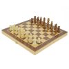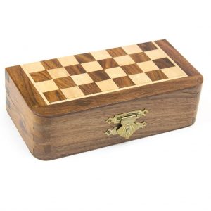 Zelo majhen potovalni magnetni šah z lesenimi figurami in leseno intarzija ploščo, ki meri 13x13cm. Plošča je zložljiva in vanjo lahko pospravite vse figure.