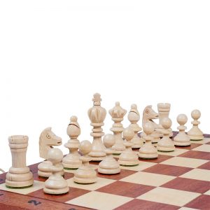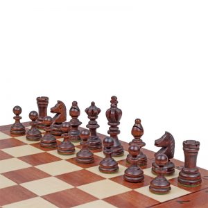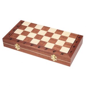 Manjša verzija Olympic šaha z intarzijo iz lesa mahagonija in sinkamore.