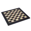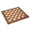 Srednje velika šahovska plošča iz lesa mahagonija in javorja. Plošča ima polja v velikosti 45 mm.