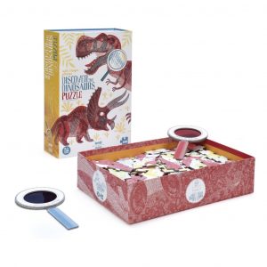 Sestavljanka za otroke s 200 koščki ter dvema povečevalnima stekloma, ki nam prikaže dinozavre v dveh oblikah – v naravi in okostja v muzeju.