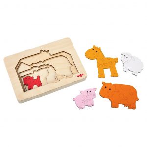 Zabavna vstavljanka za mlajše otroke, v kateri je potrebno na ploščo pravilno zložiti različne živali s kmetije.